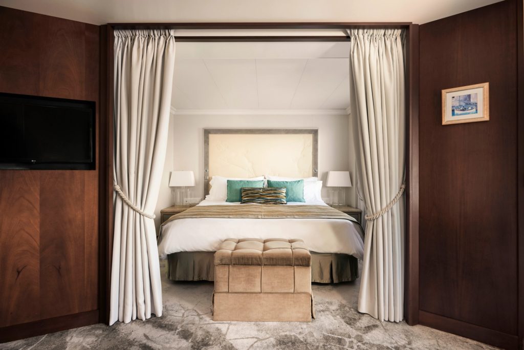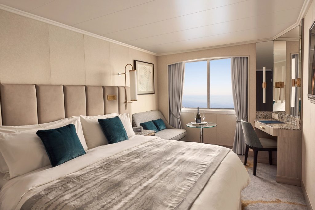 Single Guest Room with Ocean View – Introduced in 2023 and designed for solo travellers. Ocean-view accommodation with comfortable detailing and butler service. An excellent choice for a solo luxury cruise experience without the usual single-supplement premium.